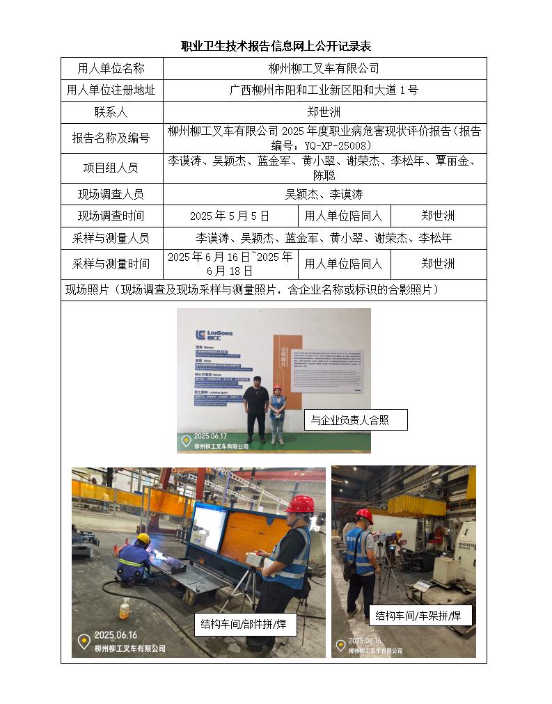 柳州柳工叉車有限公司2025年度職業(yè)病危害現(xiàn)狀評(píng)價(jià)報(bào)告